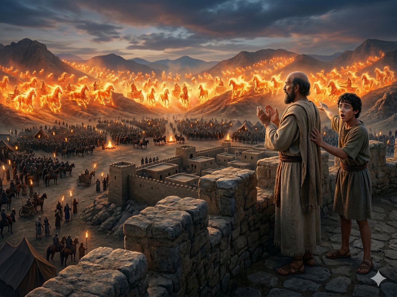💡 이 장면에서 달라진 것은 아무것도 없었습니다. 시리아 군대도 그대로였고, 도단 성도 여전히 포위되어 있었습니다. 그러나 모든 것이 달라졌습니다. 바로 보이는 것이 달라졌기 때문입니다. 불 말과 불 수레는 어느 날 갑자기 내려온 것이 아니라, 그가 보기 전부터 이미 거기에 있었습니다.
