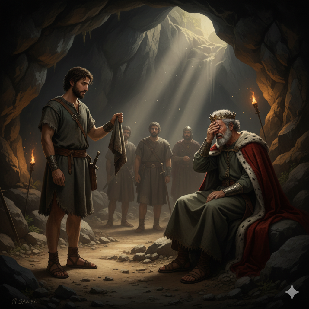👑[사무엘상 24:12, 새번역] 이제는 주님께서, 나와 임금님 사이에서 재판관이 되시고, 나의 억울한 것을 주님께서 직접 풀어 주시기 바라겠습니다. 나의 손으로는 직접 임금님께 해를 끼치지 않겠습니다. 하나님의 주권을 신뢰하는 다윗 이것은 복수를 위한 기회인가?? 또 다른 의미의 사건인가? 도망자 다윗. 셀라하마느곳에서 가까스로 생명을 건짐. (하나님의 개입) 사울VS다윗 광기에 가까운 사울. 나라 통치는 뒷전. 용변을 하러 간